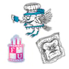 Vinyl sticker set containing Josiah Frosting, holographic FU cake logo and a clear Homunculus. Stickers approximately 3x3 inches each.